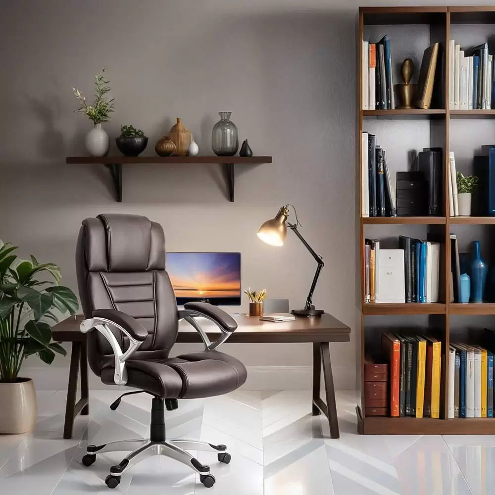 Această piesă de mobilier nu este doar un simplu scaun, ci o veritabilă interfață între ambiția personală și confortul fizic, fiind proiectată ca un sistem reactiv ce transformă orele de concentrare într-o experiență fluidă. Designul său emană o rigoare arhitecturală citadină, unde fiecare segment a fost calibrat pentru a comunica autoritate și bun-gust. Într-o lume a soluțiilor complicate inutil, acest scaun propune o inginerie eficientă și o estetică de lux, integrându-se cu o naturalețe desăvârșită atât într-un birou rezidențial minimalist, cât și în inima unor clădiri de birouri vibrante. Identitatea vizuală a structurii superioare este dominată de o geometrie rectangulară distinctivă, care reliefează în partea superioară o tetieră de format trapezoidal. Această zonă, delimitată prin cusături perimetrale precise, oferă un punct de sprijin cervical strategic, esențial pentru eliberarea tensiunii acumulate în timpul sesiunilor de lucru prelungite. Spătarul, îmbrăcat integral în piele ecologică de înaltă calitate, prezintă un design de tip „pernă ergonomică” segmentată prin cusături orizontale și verticale arcuite. Această fragmentare a suprafeței nu este doar un detaliu vizual inteligent, ci o soluție de inginerie a confortului, astfel, buretele de înaltă densitate din interior se mulează natural pe curbura lombară, distribuind presiunea corporală în mod uniform și prevenind oboseala musculară. Șezutul urmează aceeași logică structurală a spătarului, transformând contactul tactil într-o experiență de tihnă și deconectare. O trăsătură sculpturală remarcabilă este relieful în oglindă a pernei frontale care repeta motivul arhitectural al tetierei, prin intermediul unui profil supraînălțat. Această formă specifică are rolul biomecanic de a asigura o poziționare corectă a bazinului și de a reduce compresia în zona poplitee, favorizând o circulație venoasă optimă. Brațele scaunului, adevărate piese de artă industrială, sunt construite dintr-un polimer solid finisat în nuanțe argintii. Acestea includ un decupaj triunghiular care adaugă o notă exotică și aerisită siluetei, fiind în același timp prevăzute cu zone de sprijin moi, tapițate în piele, pentru a relaxa centura scapulară. Mecanica subiacentă a piesei funcționează ca un sistem modular de înaltă precizie. La baza experienței dinamice stă mecanismul de balans acționat manual, care permite scaunului să răspundă subtil micro mișcărilor utilizatorului. Această capacitate de oscilație este vitală pentru sănătatea discurilor intervertebrale, permițând coloanei să respire prin schimbarea constantă a axei de greutate. Reglajul pneumatic al înălțimii, facilitat de un piston de oțel robust protejat de o carcasă tehnică, asigură alinierea perfectă a picioarelor cu solul, consolidând stabilitatea întregului ansamblu. Punctul de sprijin pe sol este asigurat de o bază stelată cu cinci brațe, un triumf al stabilității ce combină oțelul cu polimerii ranforsați atât în poziția de staționare cât și în timpul rulajului. Un detaliu ce denotă profesionalism este adăugarea protecțiilor de colț împotriva zgârieturilor și murdăriei la capătul fiecărui braț, asigurând longevitatea estetică a piesei indiferent de intensitatea utilizării. Roțile din plastic tehnic sunt proiectate pentru o mobilitate silențioasă, permițând tranziții line fără a perturba liniștea spațiului de lucru sau a deteriora pardoseala. În scopul îmbunătățirii experienței utilizatorului, scaunul propune o sinergie între luxul tactil al pielii care oferă o senzație de căldură primitoare și rigiditatea logică a plasticului tehnic. Această combinație garantează nu doar o durabilitate remarcabilă, ci și o ușurință în întreținere, factor esențial pentru mediile comerciale și rezidențiale moderne. Elementele mecanice sunt integrate armonios în profilul scaunului, fără a crea dezordine vizuală, păstrând o linie curbă și primitoare care invită la interacțiune. În esență, acest scaun este mai mult decât un obiect static, este un partener ergonomic care înțelege nevoia de mișcare a corpului uman. Prin alinierea posturală impecabilă și capacitatea de a absorbi șocurile greutății proprii, el oferă o valoare experiențială superioară, transformând productivitatea într-o stare de bine. Este soluția ideală pentru cei care nu fac compromisuri între eleganța de standardizată și performanța biomecanică.