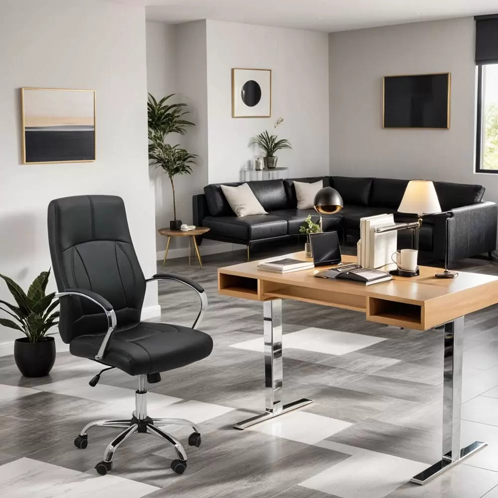 Există obiecte care ocupă un spațiu și există obiecte care îl definesc. Acest scaun de birou cu profil elegant și proporții atent calibrate aparține celei de-a doua categorii. Silueta sa minimalistă, construită pe dialogul dintre pielea fin cusută și o structură din oțel cromat cu finisaj oglindă, creează o prezență coerentă, sigură pe sine, perfect integrată în interioare contemporane. Forma este prima declarație. Spătarul, cu linie superioară dreaptă și nefragmentată, urmează o curbă discretă în „S”, adaptată biomecanicii coloanei vertebrale. Geometria sa amintește de o placă rectangulară fin șlefuită, cu muchii netezite și proporții echilibrate. Interiorul este îmbrăcat în piele de înaltă calitate, plăcută la atingere, cu o textură suplă și rezistentă la uzură, în timp ce exteriorul continuă aceeași notă cromatică, oferind coerență vizuală din orice unghi. Cusăturile tehnice, convexe și concave, creează o topografie subtilă pe suprafața de contact. Partea superioară este împărțită vertical printr-o linie centrală, marcând o axă de simetrie care ordonează compoziția. În zona mediană și inferioară, liniile decorative nu sunt doar estetice, ele delimitează zone de sprijin diferențiat, sugerând un suport progresiv pentru zona toracică și lombară. Spătarul este umplut cu spumă poliuretanică de densitate ridicată, calibrată pentru a oferi rezistență elastică și revenire controlată, fără a pierde din tonifierea profilului. Șezutul preia limbajul formal al spătarului, dar îl amplifică în volum. Perna din spumă cu densitate superioară este semnificativ mai groasă și este concepută să distribuie uniform presiunea pe întreaga suprafață de contact. Profilul frontal rotunjit funcționează ca o margine ergonomică, reducând compresia la nivelul coapselor și favorizând circulația. Cusăturile definesc o geometrie pătrată amplă în centru, încadrată de margini ușor ridicate, care stabilizează postura fără a limita mișcarea. Două linii de cusături paralele pornesc din zona spătarului și traversează în adâncime șezutul cu scopul de a extinde stabilitatea materialelor și pe conturul frontal, integrând vizual și funcțional întreaga suprafață. Brațele fixe, cu arhitectură ovală din oțel cromat lustruit, completează ansamblul cu un gest structural elegant. Fiecare suport descrie o elegantă curbură arcuită care conectează șezutul cu spătarul, ceea ce consolidează rigiditatea laterală a structurii. Partea superioară este căptușită și îmbrăcată în piele asortată, oferind o zonă de sprijin confortabilă pentru antebrațe, reducând tensiunea din zona umerilor și a gâtului. Cromul oglindește lumina ambientală, adăugând profunzime și un accent sofisticat fără a încărca vizual atmosfera. Dincolo de expresia estetică, acest scaun este un sistem mecanic coerent. Sub șezut, mecanismul de balans acționat prin levier permite o mișcare controlată de reclinare, adaptată greutății utilizatorului prin ajustarea tensiunii. Această funcție favorizează micromișcările naturale ale corpului, prevenind rigiditatea și menținând activă musculatura posturală. Blocarea în poziție fixă oferă stabilitate atunci când concentrarea impune adoptarea unei poziții statice. Reglajul pneumatic al înălțimii, integrat discret în coloana centrală, permite adaptarea rapidă la diferite configurații de lucru. Pistonul din oțel cromat asigură o cursă fluidă și durabilitate în timp, fără jocuri sau oscilații neprevăzute. Interacțiunea dintre spătarul curbat și mecanismul de înclinare creează o relație sincronizată între trunchi și bazin, menținând alinierea coloanei în timpul reclinării. Baza în stea cu cinci brațe, realizată integral din oțel cromat masiv, oferă un centru de greutate stabil și o distribuție optimă a sarcinilor. Fiecare braț este dimensionat pentru a susține eficient masa totală, iar roțile din polimer tehnic bicolor asigură rulare lină pe multiple tipuri de suprafețe. Materialul compozit al roților îmbină rezistența la abraziune cu o aderență controlată, reducând zgomotul și protejând pardoseala. Toate elementele mecanice sunt integrate în siluetă fără excese vizuale. Levierul, butonul de reglaj al tensiunii și cilindrul pneumatic sunt poziționate ergonomic și discret, menținând puritatea liniilor. Rezultatul este o piesă care funcționează ca un organism coerent, nu ca o sumă de componente. Acest scaun nu este doar un loc unde te așezi, este o platformă pentru productivitate, un suport pentru coloană și o declarație de stil. Se adaptează natural spațiilor compacte sau interioarelor elaborate, aducând autoritate și echilibru. Scaunul, îmbină confortul inteligent cu un cost accesibil, oferind performanță pe termen lung fără compromisuri estetice.