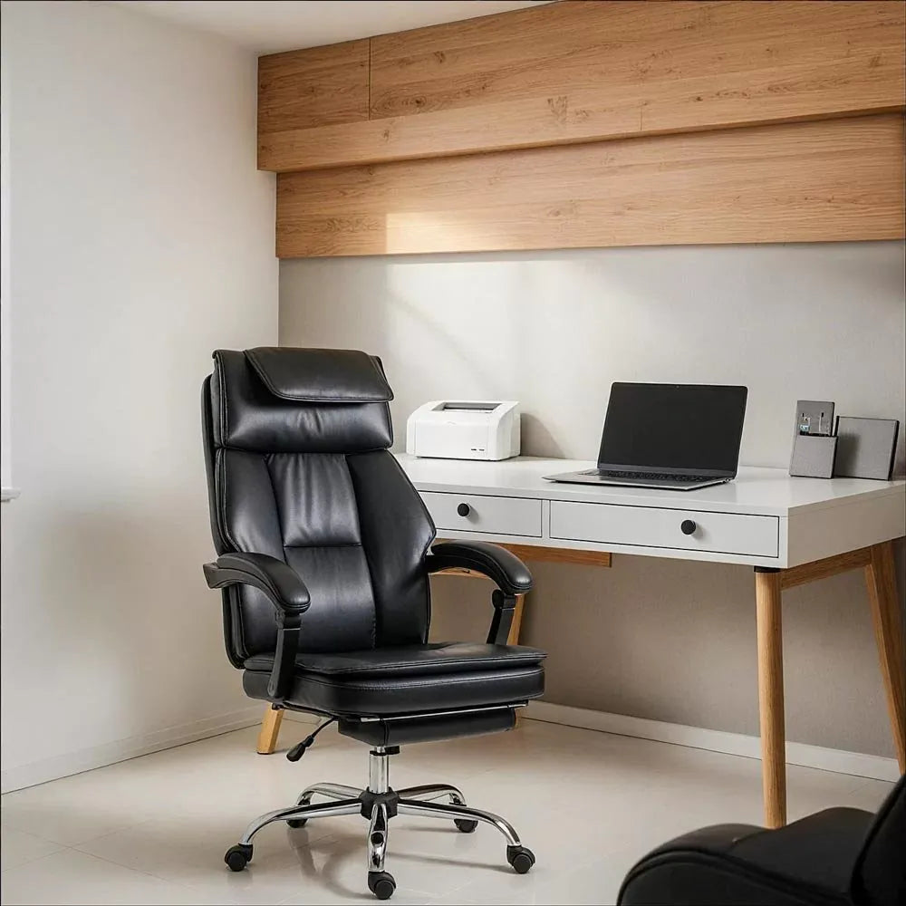 Acest scaun executiv din piele reprezintă o combinație perfectă între designul contemporan, confortul de excepție și un preț accesibil, făcându-l ideal pentru birouri moderne sau spații de lucru dotate corespunzător. Din punct de vedere estetic, scaunul se remarcă prin liniile elegante și cusăturile contrastante, care oferă un aer rafinat și modern. Pielea luxoasă de înaltă calitate transmite note vibrante, integrându-se cu ușurință în orice decor contemporan. Detaliile cromate, cum sunt baza din oțel lucios și mecanismele de reglare, accentuează aspectul sofisticat al scaunului, adăugând un plus de stil și profesionalism. Caracteristica unică a acestui scaun este stratul dublu de căptușeală și perne care urmează liniile spătarului și ale șezutului, culminând cu un suport extensibil pentru picioare. Spătarul este prevăzut cu perne ample, incluzând o pernă dublă pentru sprijinul capului, perne laterale pentru zona toracică, precum și suport lateral pentru coapse, oferind un grad de confort superior. Cotierele sunt căptușite și tapițate cu piele de clasă superioară, asigurând o relaxare totală a brațelor atât în timpul lucrului cât și în timpul pauzelor. Aceste elemente de confort sunt completate de suportul căptușit pentru picioare, care permite relaxarea picioarelor în timpul binemeritatelor pauze de lucru. Funcția de rabatare a spătarului permite poziționarea acestuia și a șezutului la o deschidere de 170 de grade, transformând scaunul într-un refugiu sigur de relaxare. În același timp, suporturile laterale pentru coapse, pernele cervicale și laterale, precum și suportul pentru brațe tapițat în piele asigură un confort superior pe tot parcursul zilei. Lista caracteristicilor orientate spre confort continuă cu reglajul pneumatic amortizat al înălțimii, rotația completă de 360 de grade și roțile multidirecționale. Aceste elemente se combină pentru a crea o piesă de mobilier complet echipată, potrivită atât pentru ore lungi de muncă, cât și pentru momente de relaxare profundă. Funcțiile de confort ale structurii superioare sunt acționate prin intermediul a două manete mecanice, una dedicată reglării tensiunii și celălalt pentru ajustarea înălțimii și înclinării. Structura inferioară este formată dintr-o coloană cromată reglabilă, amortizată, și o bază cu cinci brațe, care distribuie greutatea uniform prin intermediul a cinci role din plastic cauciucat. Aceste role multidirecționale asigură o deplasare rapidă și silențioasă pe diferite tipuri de pardoseli finisate cu lemn, ceramică și beton. Scaunul este ranforsat cu materiale de calitate superioară pentru a suporta o greutate recomandată de 150 kg, permițând oricărui utilizator să lucreze confortabil de-a lungul unui program complet. Scaunul este construit pentru a rezista în timp, fiind fabricat din materiale durabile, garantând o investiție inteligentă pe termen lung. Nu în ultimul rând, cusăturile contrastante, care pun în evidență firul alb pe pielea luxoasă neagră, adaugă o notă discretă de creativitate și originalitate. Acest scaun contribuie la imaginea unui spațiu de lucru primitor și profesional, designul integral din piele îmbogățit cu cusături funcționale și estetice, sugerând starea de bine necesară unui mediu de lucru productiv. Raportul calitate-preț este unul excepțional. Materialele premium și caracteristicile multiple, pornind de la reglajul pneumatic al înălțimii și funcția de rabatare până la suportul pentru picioare și roțile multidirecționale, asigură o experiență de utilizare premium la un cost accesibil. Acest scaun executiv nu este doar o piesă de mobilier, ci o declarație de stil modern, combinând cu succes eleganța, funcționalitatea și prețul accesibil. Perfect pentru profesioniștii care apreciază atât confortul, cât și estetica unui design contemporan.