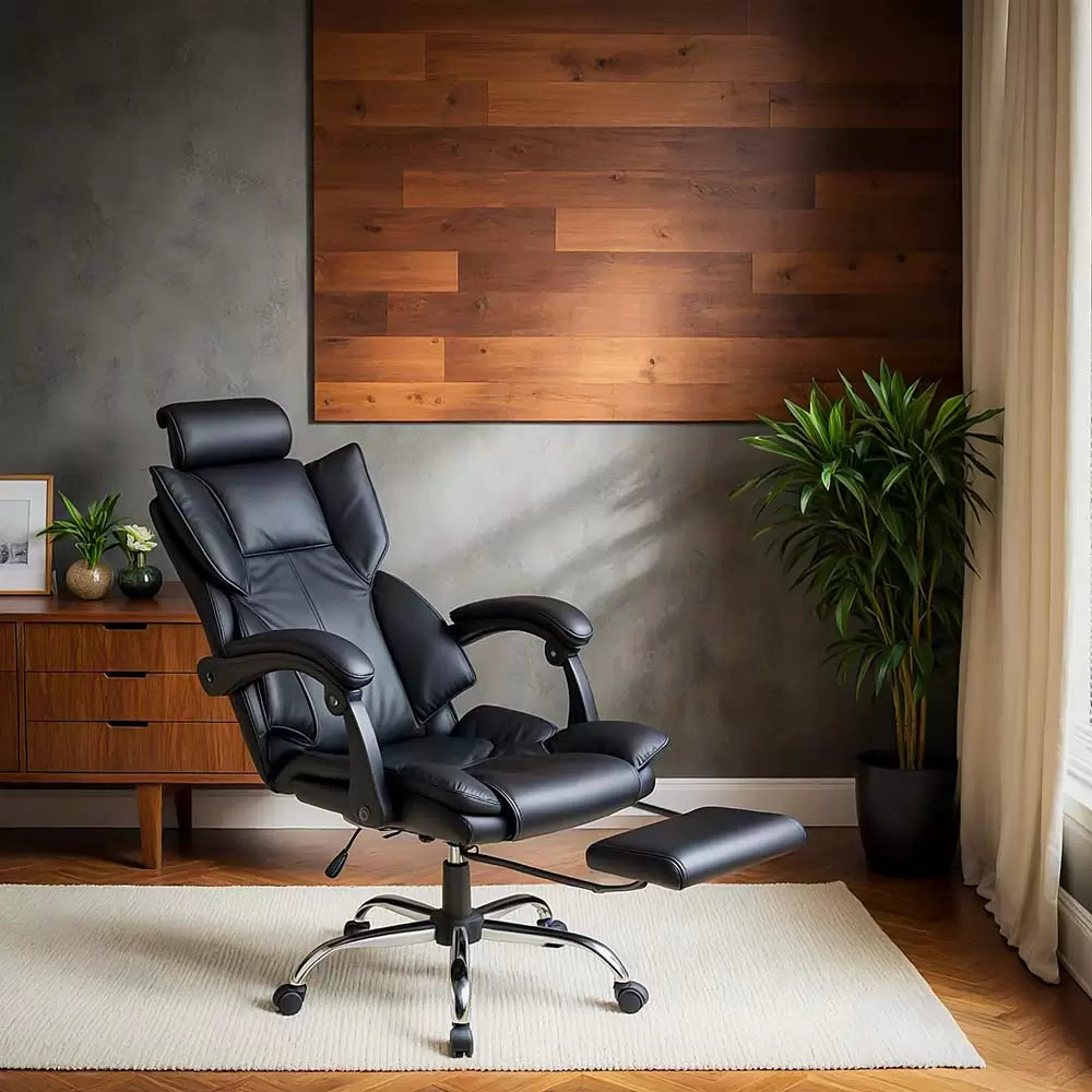 Silueta acestui scaun executiv impresionează din primul moment prin verticalitatea sa suplă și proporțiile atent calibrate. Spătarul înalt, unul dintre cele mai generoase din categoria sa, trasează o linie continuă și elegantă, integrând armonios tetiera într-o compoziție coerentă. Arhitectura zveltă evocă vitalitate și echilibru vizual, iar volumul amplu conturat al pernelor conferă prezență și stabilitate în orice ambient contemporan. Designul cu perne duble ușor migdalate care îmbracă zona centrală și flanchează lateral tetiera, spătarul și șezutul, creează o estetică sofisticată, în care suprafețele din piele netedă, demarcate prin cusături adânci, pun în valoare măiestria execuției și atenția pentru detaliu. Ergonomia este fundamentul invizibil al acestei construcții. Tetiera secțională, compusă dintr-un element superior dreptunghiular și o bază cu formă de „cheie de boltă” integrată în spătar, susține zona occipitală și cervicală fără a bloca libertatea de mișcare. Această configurație reduce tensiunea acumulată în mușchii sternocleidomastoidian și trapez superior, permițând menținerea unei alinieri naturale a coloanei cervicale. Spătarul, cu design central amplu, ușor concav, amintește de forma stilizată a unei piese de șah, și este divizat printr-o cusătură verticală dublă care ghidează vizual axul coloanei vertebrale. Zona lombară este susținută progresiv, favorizând poziționarea fiziologică a vertebrelor L1 L5 și reducând presiunea asupra discurilor intervertebrale în timpul sesiunilor prelungite. Lateralele înălțate ale spătarului funcționează ca stabilizatori posturali, menținând alinierea bilaterală simetrică a scapulelor și limitând deviațiile laterale care pot suprasolicita musculatura paravertebrală. Această abordare biomecanică susține activ musculatura erectorilor spinali și optimizează distribuția greutății corporale pe întreaga suprafață de contact. Șezutul continuă logica formală a spătarului printr-o geometrie rectangulară bine definită, accentuată de cusături profunde ce delimitează zona centrală de pernele laterale. Forma concavă discretă centrează masa corporală pe tuberozitățile ischiatice și reduce tendința de alunecare. Profilul frontal ușor ridicat, realizat dintr-o pernă generoasă îmbrăcată în piele fină, minimizează compresia asupra regiunii poplitee și sprijină circulația adecvată la nivelul membrelor inferioare, diminuând oboseala musculară a gambei și a coapsei. Materialitatea exprimă durabilitate și rafinament. Pielea netedă de înaltă calitate și cusăturile de adâncime oferă o senzație tactilă tonifiată și o rezistență superioară la uzură. Sub tapițerie, buretele de înaltă densitate este modelat pentru a combina fermitatea structurală cu adaptabilitatea la contururile corpului. Stratul superior primește greutatea într-un mod elastic, în timp ce nucleul interior menține integritatea formei și previne tasarea prematură. Structurile interne din polimeri ranforsați asigură rigiditate controlată și distribuie uniform solicitările mecanice. Cotierele articulate, realizate din polimer tehnic negru cu design sculptural, sunt tapițate în piele cusută fin și se mișcă sincron cu spătarul în timpul rabatării. Această integrare menține unghiul optim între antebraț și trunchi, protejând articulația umărului și reducând tensiunea din deltoid și zona cervicală. Sistemul de extensie pentru picioare, montat pe un cadru glisant din oțel cromat, adaugă o dimensiune suplimentară de confort. Perna rectangulară, generoasă și bine căptușită, susține gambele și favorizează relaxarea mușchilor gastrocnemian și soleus atunci când scaunul este înclinat. Inteligența mecanică este discret integrată în siluetă. Reglajul pneumatic pe înălțime permite adaptarea la diverse configurații de lucru, asigurând poziționarea corectă a șoldurilor față de planul mesei. Cele două manete laterale controlează balansul și blocarea în diferite unghiuri de confort, oferind libertatea micromișcărilor sau stabilitate fermă în poziție fixă. Pistonul din oțel cromat, protejat de un înveliș din plastic negru, susține ansamblul cu o eficiență structurală superioară, iar baza cu cinci brațe din oțel cromat, garantează echilibru și rezistență. Rolele tehnice din plastic negru cu inserții cauciucate facilitează deplasarea fluidă fără a compromite stabilitatea. Toate aceste elemente funcționează ca un sistem dinamic, nu ca un obiect inert. Scaunul răspunde mișcărilor, distribuie presiunea, amortizează solicitările și încurajează o postură sănătoasă pe termen lung. Se integrează natural atât în interioare rezidențiale rafinate cât și în spații multifuncționale moderne, aducând o notă de vitalitate și de echilibru estetic.