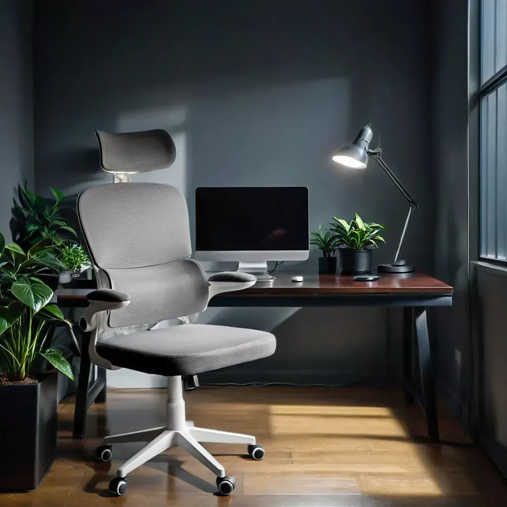 Într-un spațiu în care fiecare obiect influențează ritmul de lucru și starea fizică, acest scaun ergonomic cu identitate tehnologică devine un element central al echilibrului dintre performanță și relaxare. Silueta sa înaltă și suplă exprimă o eleganță modernă construită pe o structură albă din plastic tehnic rezistent, care conturează cu precizie zona tetierei, spătarului, brațelor și baza radială. Contrastul dintre acest cadru luminos și tapițeria din plasă exprimată în nuanțe întunecate, creează o prezență vizuală calmă și rafinată, potrivită pentru interioare contemporane în care funcționalitatea și estetica trebuie să coexiste natural. Arhitectura superioară este gândită ca un sistem biomecanic adaptiv care susține structura coloanei vertebrale în timpul perioadelor lungi de lucru. Tetiera reglabilă din plasă, urmează o geometrie concavă ce acompaniază curba naturală a regiunii cervicale și oferă sprijin constant pentru vertebrele C1 până la C7. Această zonă de suport reduce tensiunea acumulată în mușchii sternocleidomastoidian și trapez superior, permițând o poziție echilibrată a capului chiar și în timpul activităților intense la birou. Spătarul din plasă respirabilă continuă linia anatomică în formă de „S” a coloanei vertebrale, susținând armonios segmentele toracice și lombare. Structura exoschelet din plastic tehnic menține tensionată suprafața elastică a pânzei, transformând spătarul într-o membrană activă care distribuie greutatea corpului pe întreaga zonă dorsală. Secțiunea lombară mobilă reacționează la presiunea corpului și generează un contrasuport delicat asupra vertebrelor L1 până la L5. Acest mecanism natural reduce presiunea asupra ligamentelor lombare și a mușchilor erectori spinali, încurajând o poziție stabilă a bazinului și diminuând oboseala musculară acumulată în zona sacroiliacă. Șezutul introduce o altă dimensiune a confortului printr-o structură compactă din burete de înaltă densitate care susține uniform pelvisul și musculatura fesieră. Forma sa plană cu margine frontală bine definită stabilizează poziția bazinului și permite coapselor să rămână într-un unghi fiziologic favorabil circulației sanguine. Această distribuție corectă a presiunii sprijină mușchii cvadricepși și hamstring, reducând compresia asupra zonei posterioare a genunchilor și favorizând o postură activă. Brațele rabatabile, integrate în exoscheletul spătarului, completează această arhitectură ergonomică printr-o formă rotunjită care susține antebrațele și relaxează musculatura deltoidă și trapezul inferior. Căptușeala discretă din material textil oferă o senzație tactilă plăcută și stabilizează poziția articulațiilor umărului în timpul utilizării tastaturii sau a documentelor. Inteligența mecanică a scaunului este integrată discret în silueta sa. Sistemul de înclinare sincronizată permite spătarului să se recline gradual, menținând contactul constant cu zona lombară și facilitând micromișcări ale coloanei vertebrale. Această mobilitate controlată stimulează musculatura stabilizatoare a trunchiului și menține activă zona abdominală profundă. Reglajul pneumatic al înălțimii permite adaptarea poziției față de planul de lucru, astfel încât articulațiile genunchilor și ale șoldurilor să rămână într-un unghi natural care protejează ligamentele și articulațiile coxofemurale. Materialele alese reflectă aceeași logică a performanței și durabilității. Plasa tehnică permite circulația constantă a aerului și elimină acumularea de căldură în zona spatelui, menținând confortul chiar și în perioadele de utilizare prelungită. Buretele de înaltă densitate al șezutului oferă un echilibru optim între elasticitate și rezistență, iar cadrul din polimer ranforsat garantează stabilitate structurală fără a încărca vizual designul. Baza radială albă din plastic tehnic se sprijină pe cinci roți duble cu finisaj bicolor negru și alb, realizate din material cauciucat care asigură rulare silențioasă și stabilitate pe diverse tipuri de pardoseală. Pistonul din oțel este protejat de o carcasă albă ce integrează mecanismul în forma generală fără elemente mecanice vizibile, păstrând estetica minimalistă a ansamblului. Prin echilibrul dintre design aerodinamic, suport biomecanic și mecanisme intuitive de ajustare, acest scaun devine mai mult decât un simplu element de mobilier. Este o platformă ergonomică ce transformă poziția șezut într-o experiență de lucru fluidă, stabilă și regeneratoare, integrând armonios tehnologia, confortul și estetica contemporană.